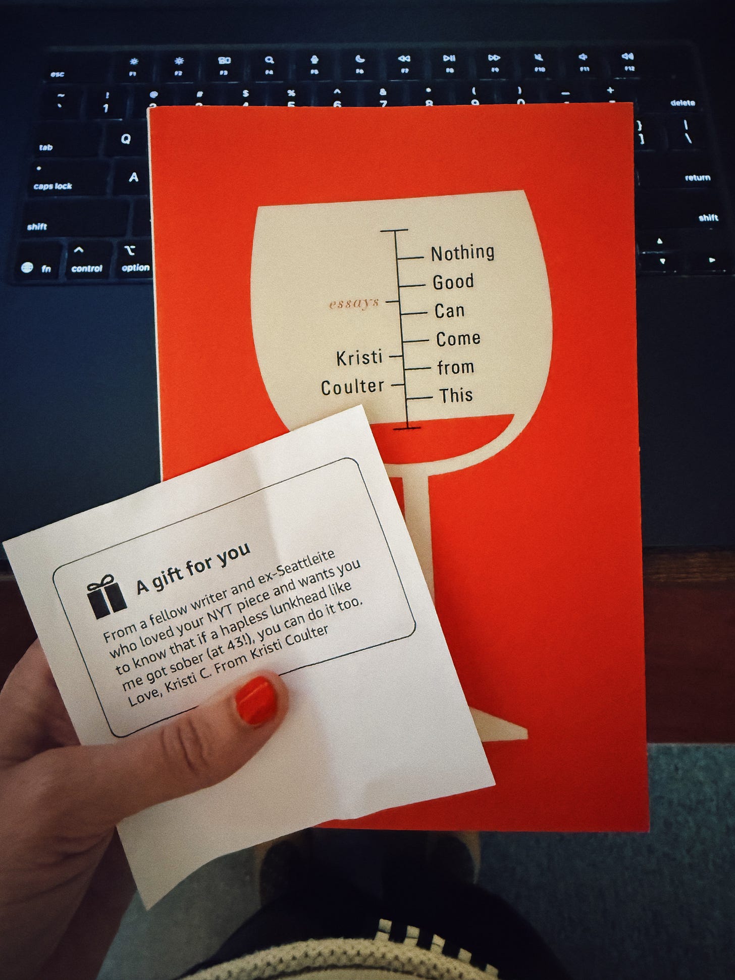I think I’ve communicated how much I’ve been trying to be graceful about taking unsolicited advice about my drinking. I thought someone (maybe a donor or a colleague) sent this book without a note and I was about to get annoyed. Then I found the note. It was from Kristi Coulter—the author! I immediately was so touched.