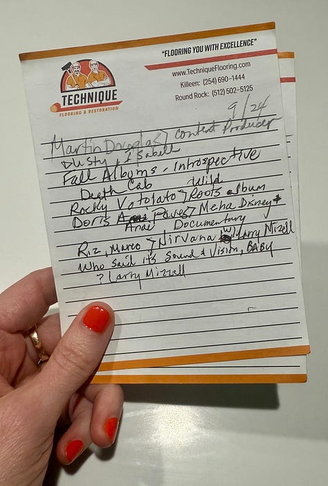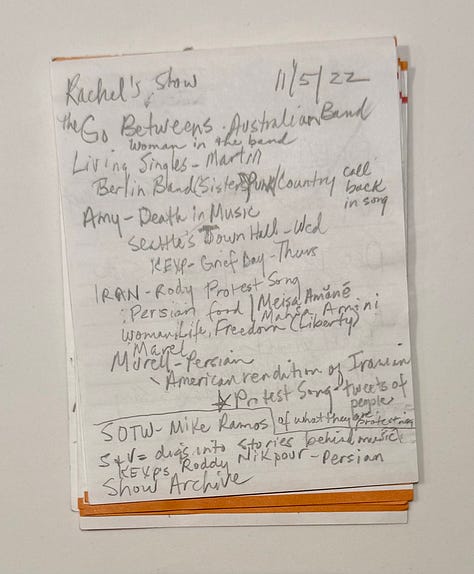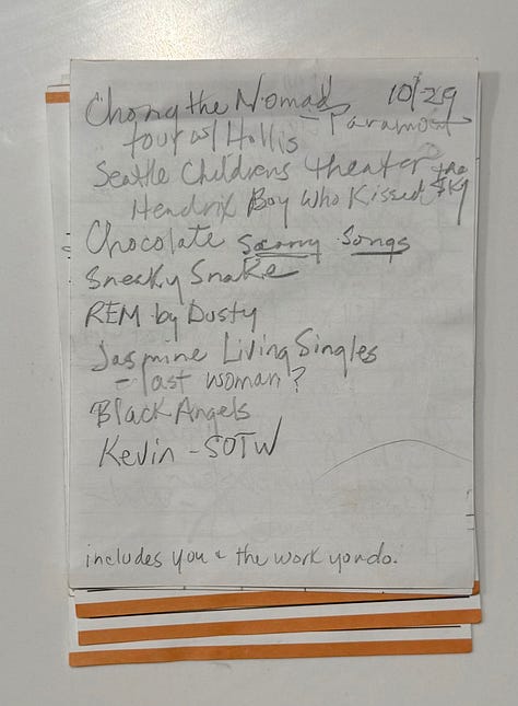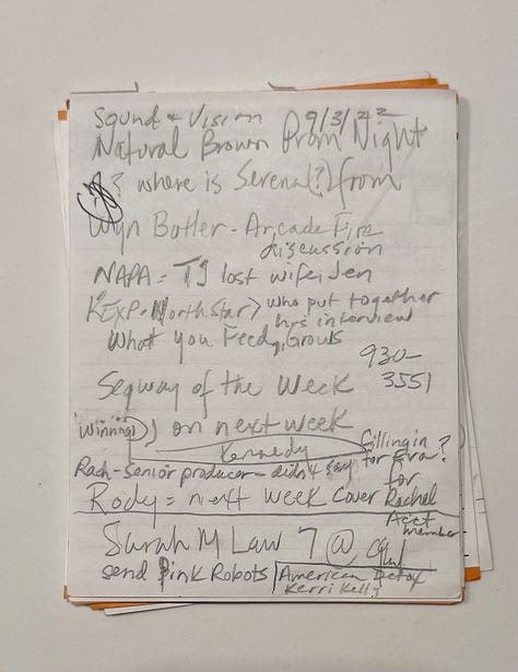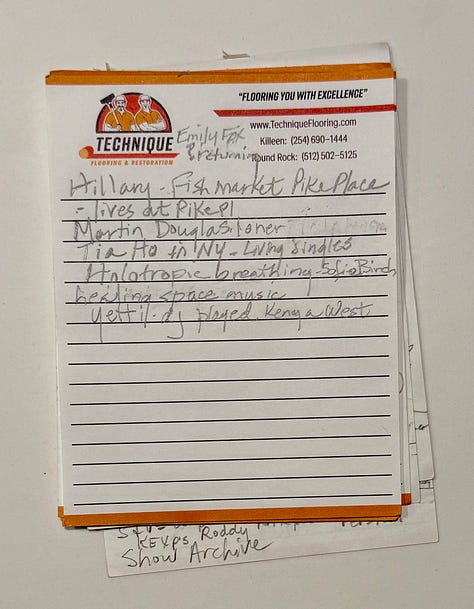 I pulled these notes out a couple weeks ago, after they lived for two years in a special box of things I keep. It made me miss so many of these KEXP friends and these stories and this music. That lightning-in-a-bottle team.