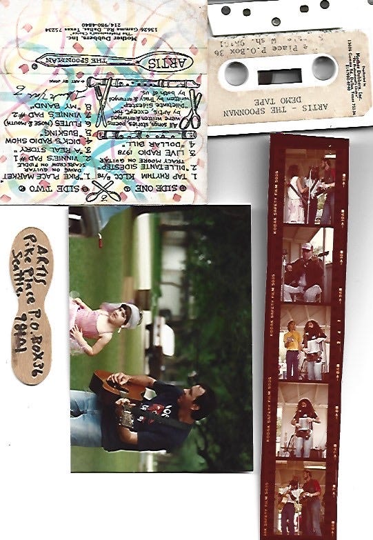 “‘I KNEW HIM!’ for about a week. Here’s one for your vintage Seattle friends. In ’79 just before I met Mom I was Washboard Leo’s manager/roadie/sideman etc. Artis was passing thru & someone took him to see Leo; it was the Big Bang of Unique Kindred Spirits. Artis was getting us excited telling us we needed to move to Seattle where Leo could be appreciated more & collaborate on fringe music with Leo’s electric washboard talents. I was also working at the bar I met Mom in as those two disappeared together for about a week. Because I was Leo’s mgr Artis gave me his business spoon & demo tape, I’ve never listened to it but I did witness live his amazing talents that quieted a room full of disinterested cowboy drunks to roar with a standing ovation at the end of his short set. Artis’s arms were buffed from all his spoon playing. He also played forks, knives, & pens to name a few. The pic of you & I are 10yrs later in ’89. The strip is from headlining a bluegrass festival in Oklahoma in ’79 shortly after I met Mom, it was our 1st roadtrip together. The festival was billed as a straight family affair. No Dogs, No Alcohol, No Drugs, No Fun. Mom, I, & band broke every rule within 15 minutes of arriving but they didn’t bust us (they could off) because we were the draw headliners. The night before it was all going to start we couldn’t sleep so around midnight in the dark some of us took to the stage & played Jimi’s ‘Third Rock From the Sun’ for a long time on banjo, washboard, beancan & maybe mandolin. The whole song is in one chord, D. Luv’ Ya To Pieces, moresoonlater……..”