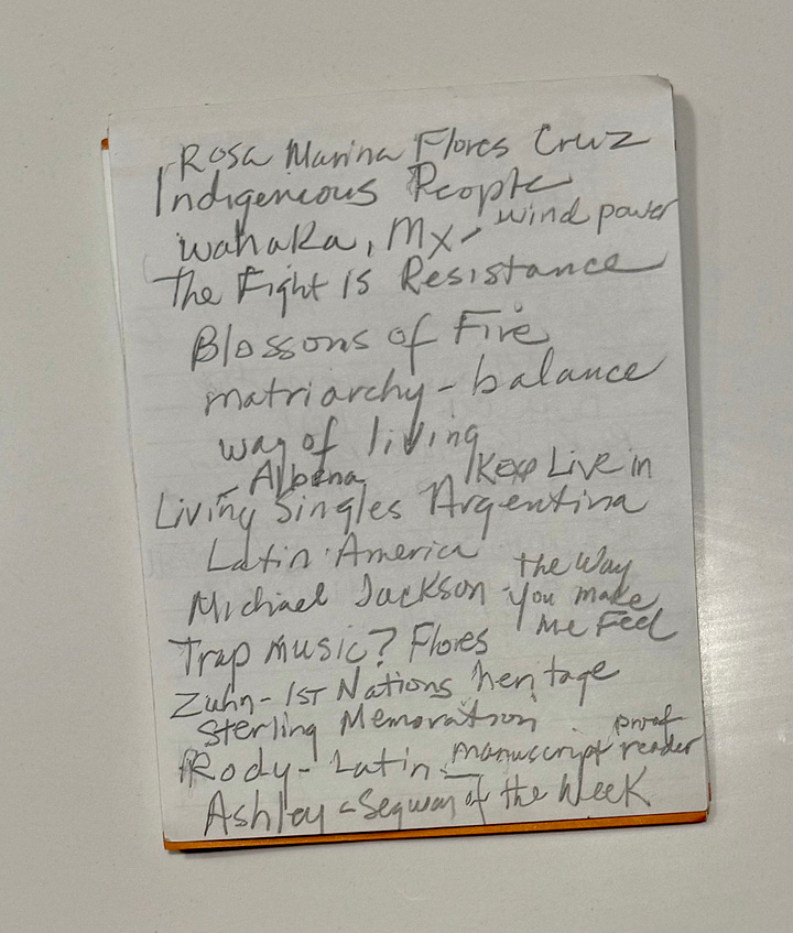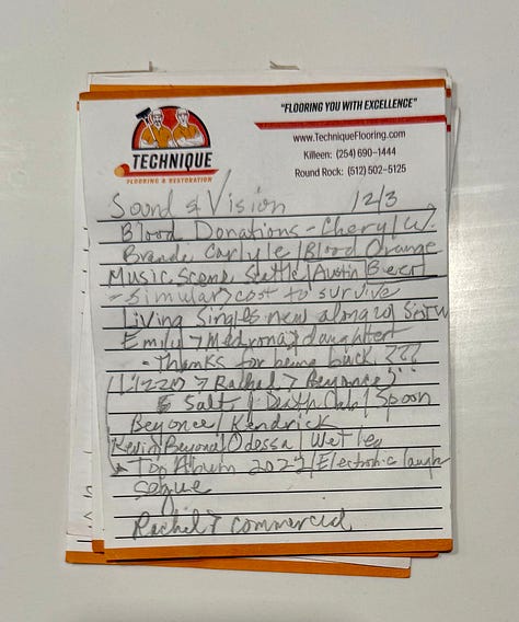 My time as the host of Sound & Vision ended at the end of 2022. We went home to Texas for Christmas that year, as did my sister and her daughters. Forty minutes after our plane landed, my dad tested positive for Covid. My mom tested positive a day later. Marcelline was still having seizures and kept getting her MRI punted, so I was very protective of her against Covid. (fuck off, 2022.) My parents stayed at a hotel for a week or so. Evan and I stayed at my BFF’s home, because her mom went to London to be with her, because her dad passed away in October. (honestly, 2022, wtf.) We didn’t get as much time with my parents as we wanted, but when we finally did, it was magic. We got a beautiful photoshoot. We got time in the backyard. We had laughs. We had time together, listening to music. And as I was about to leave my parents’ home, my mom told me to wait a second, then left and came out of her bedroom with a stack of notes and asked, “Do you want these?”